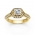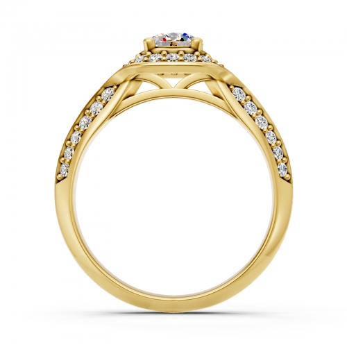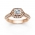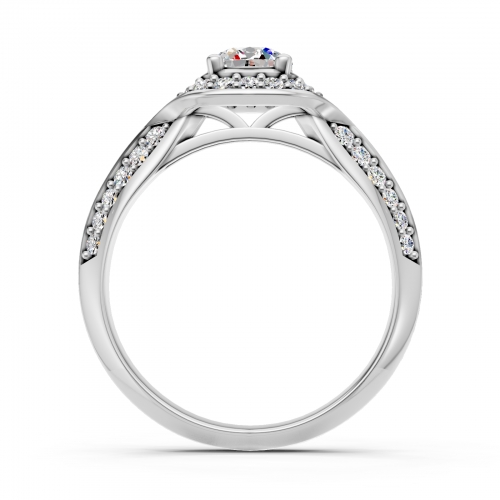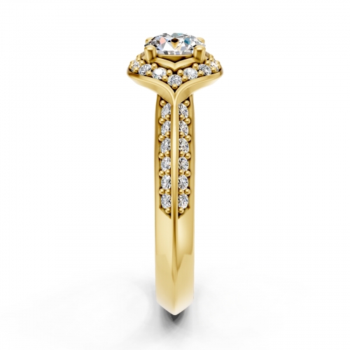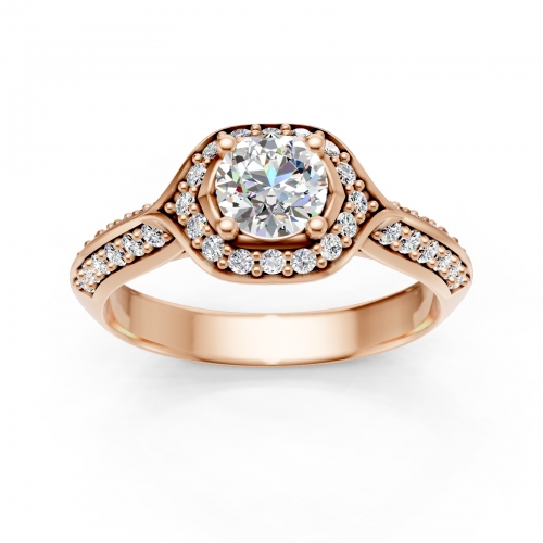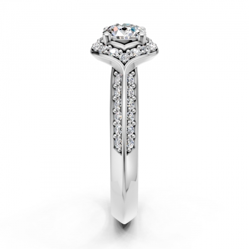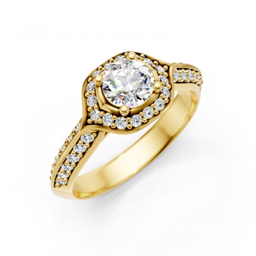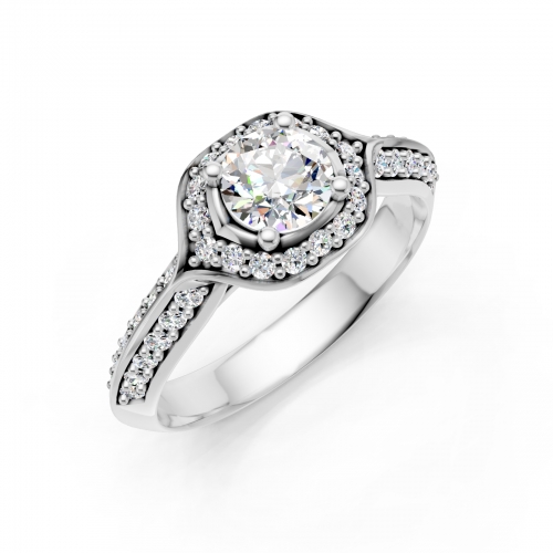 Let's unveil the magic with this elegant ring, where every dazzle tells a tale of your timeless devotion to her. This ring showcases a brilliant round diamond embraced by a gleaming hexagonal halo atop diamond-lined shoulders, adding an opulent touch to your big day.