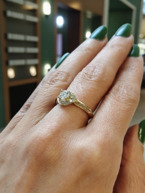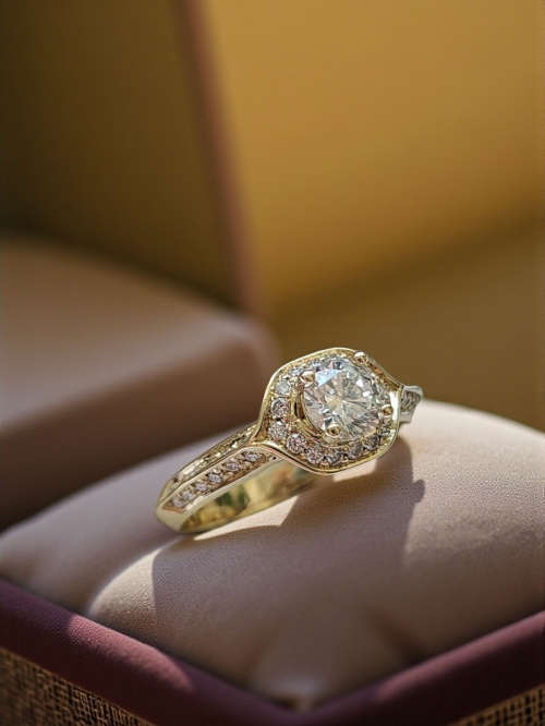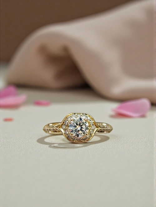 Let's unveil the magic with this elegant ring, where every dazzle tells a tale of your timeless devotion to her. This ring showcases a brilliant round diamond embraced by a gleaming hexagonal halo atop diamond-lined shoulders, adding an opulent touch to your big day.