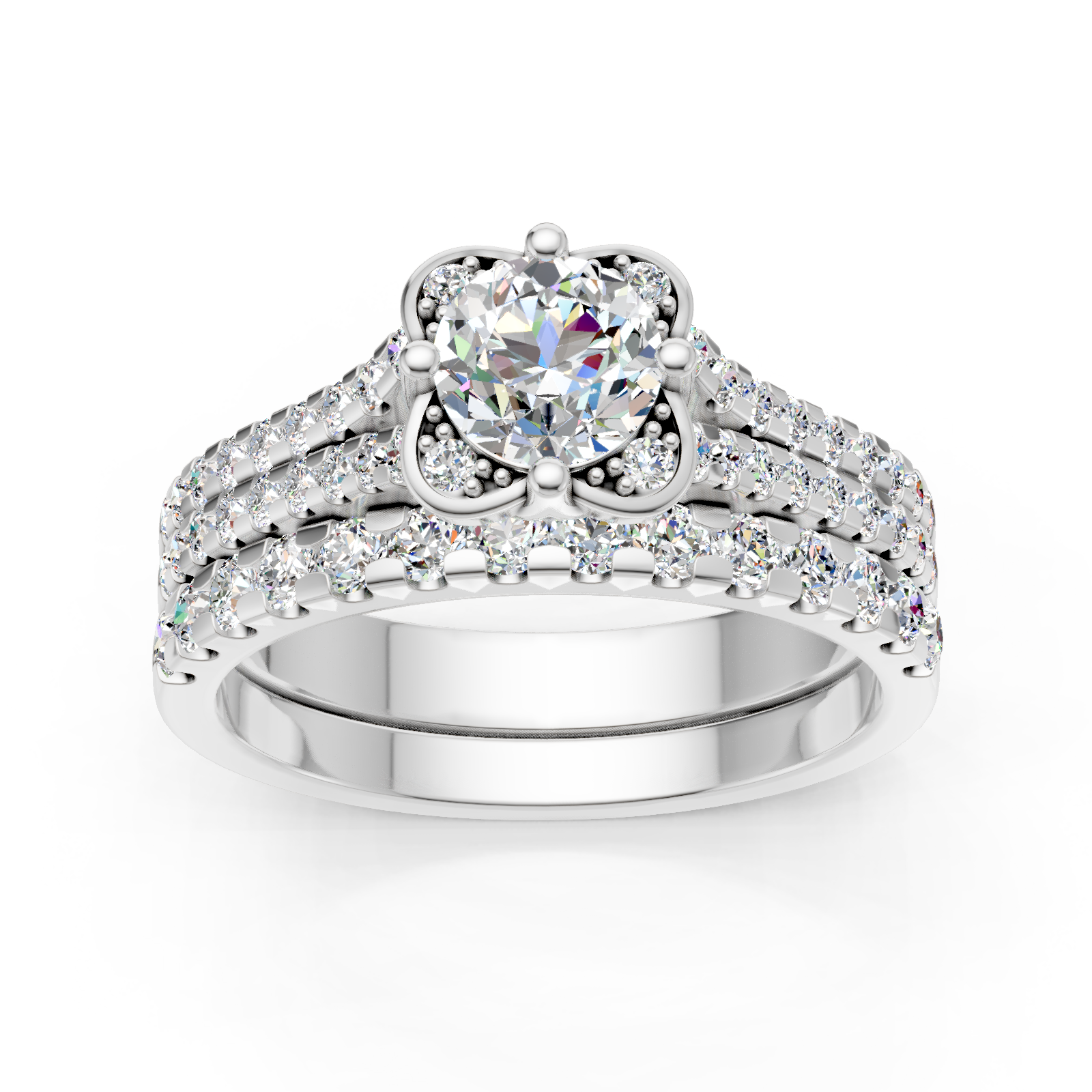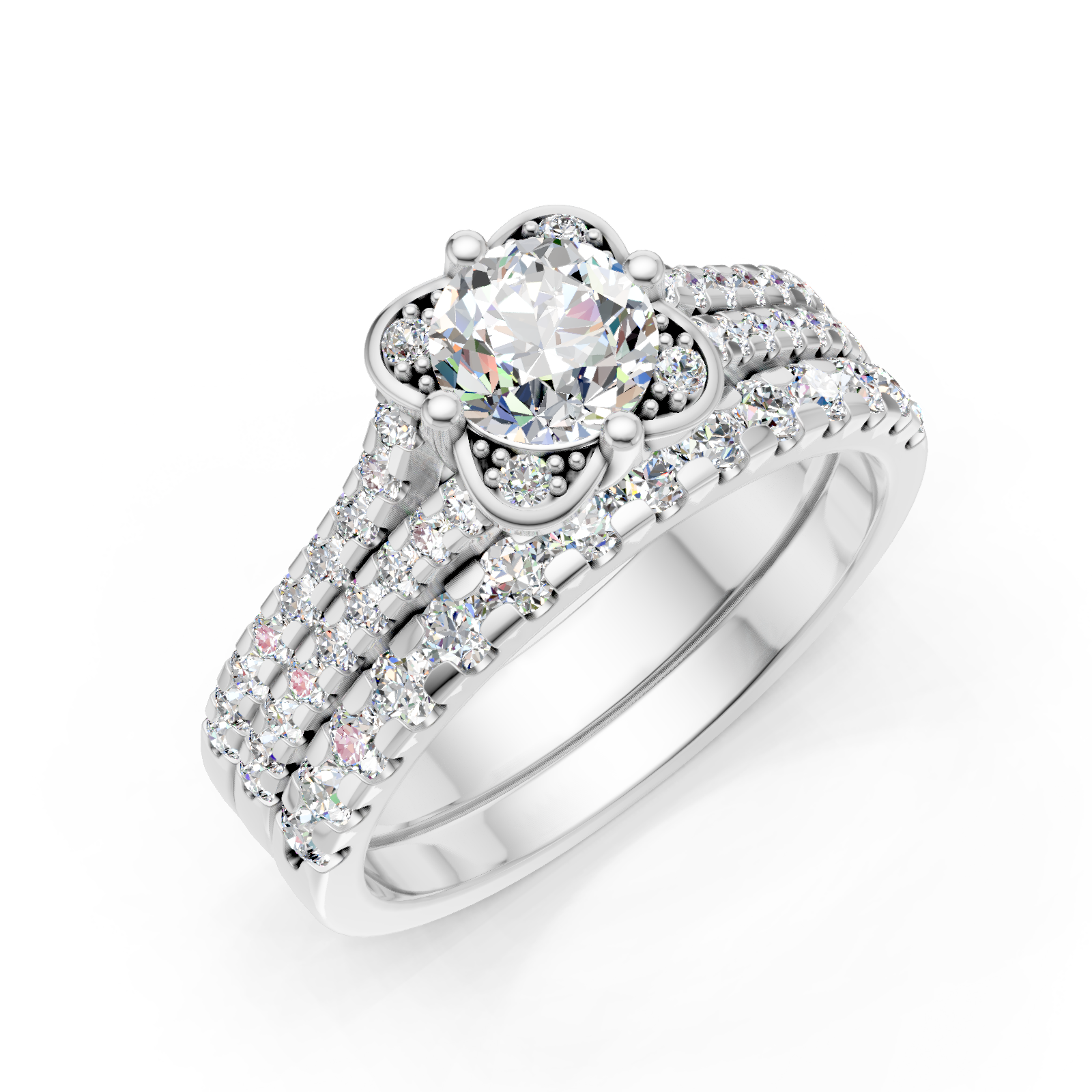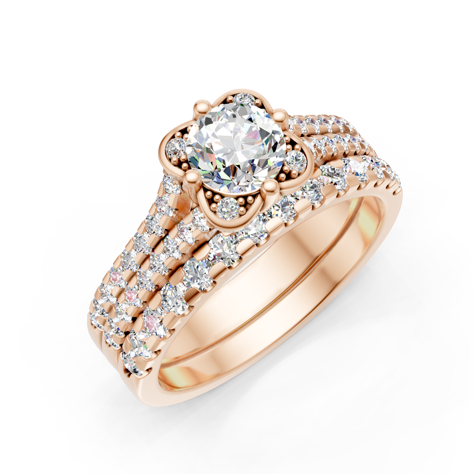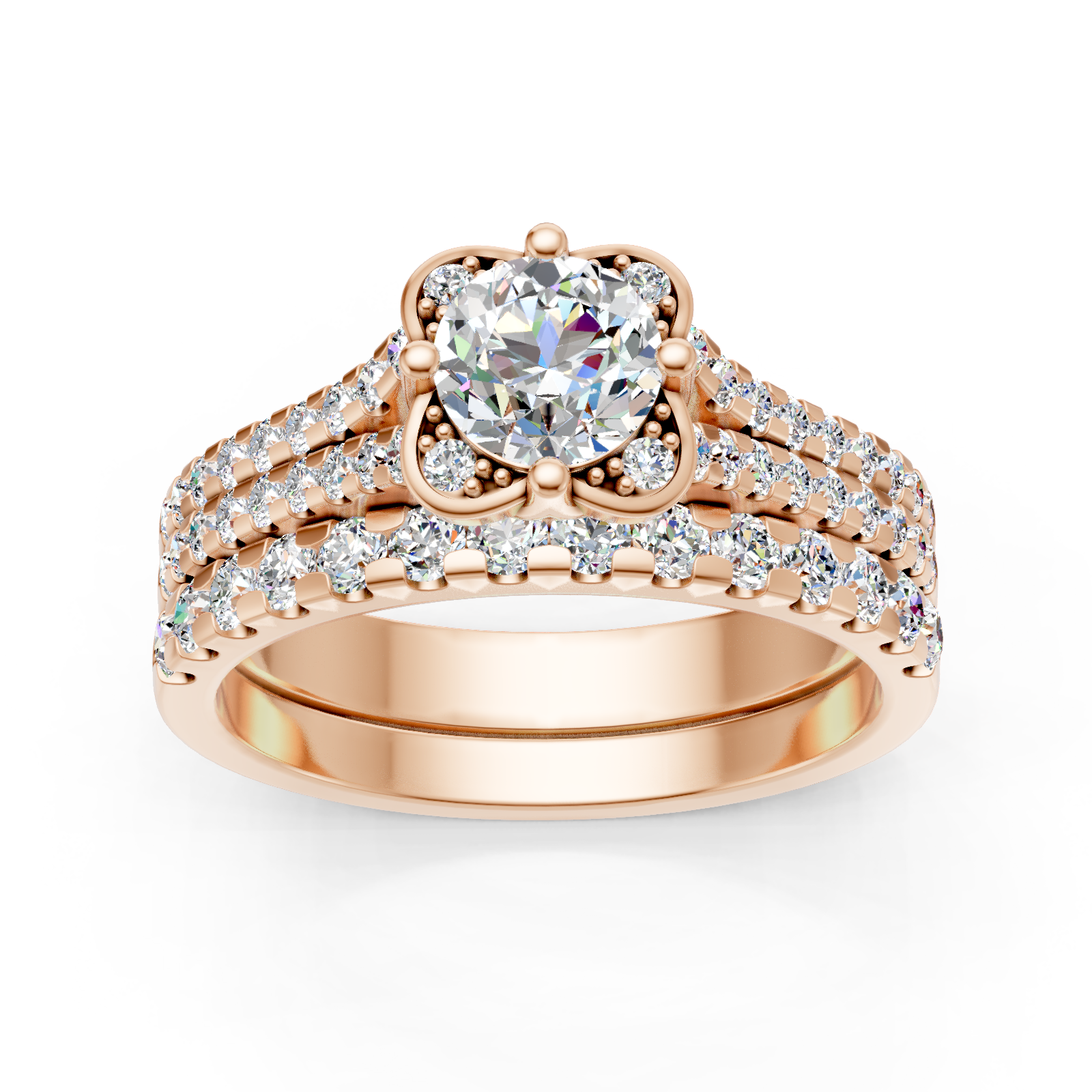 Zachwycający design podwójnego pierścionka prezentuje piękny brylant o okrągłym szlifie osadzony w tulipanowej oprawie na jednej z obrączek, która otacza pierścień czterema płatkami, powiązanymi cienką, idealnie wyprofilowaną linią; każdy płatek zdobi brylant. Dzielona szyna obrączki także ozdobiona jest rzędami mniejszych brylancików. Druga obrączka kompletu również lśni, bogato zdobiona brylantami. Na życzenie wykonamy pierścionek z żółtego, białego lub różowego złota.