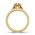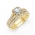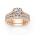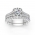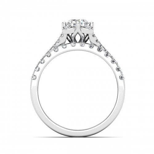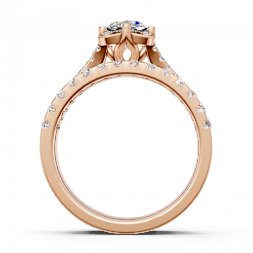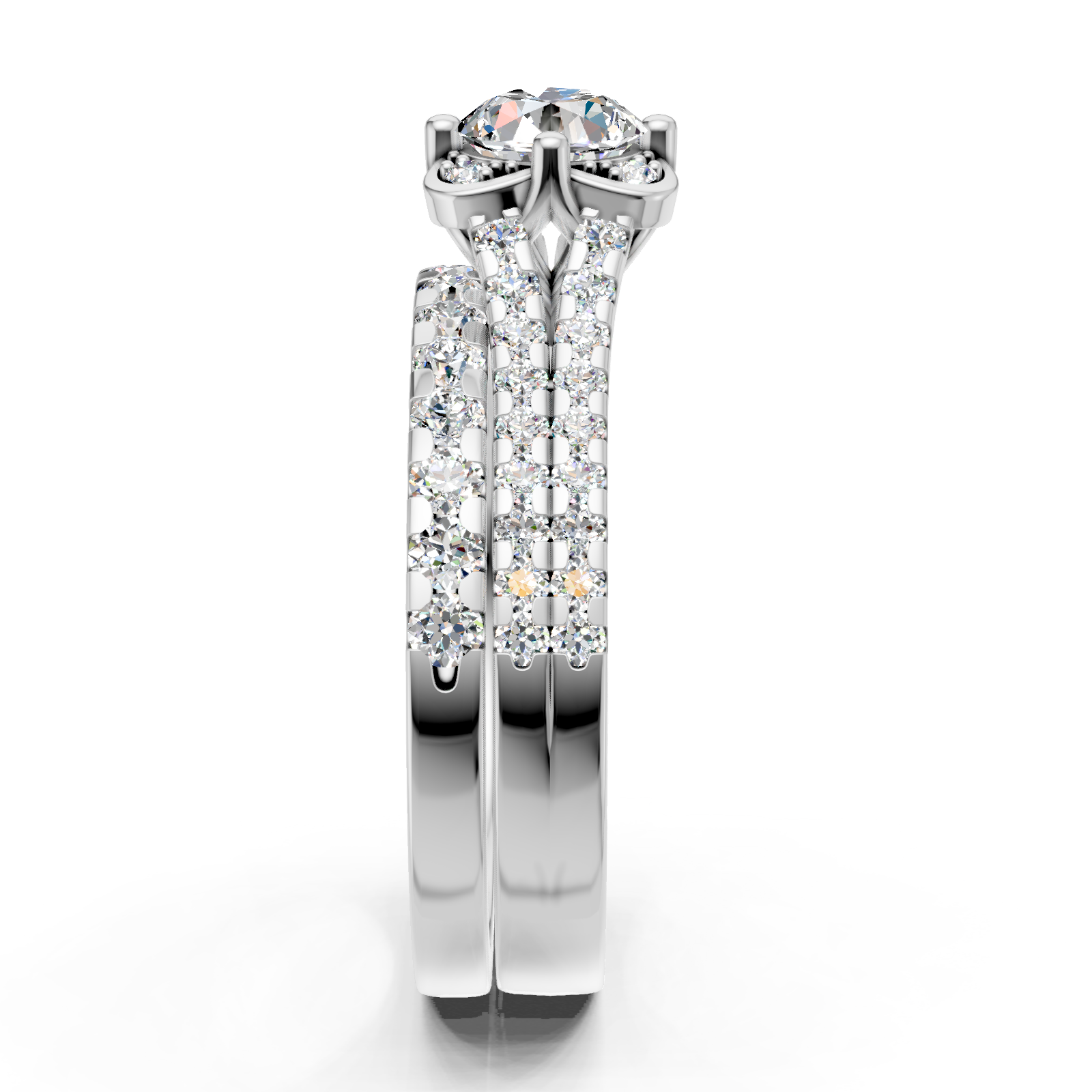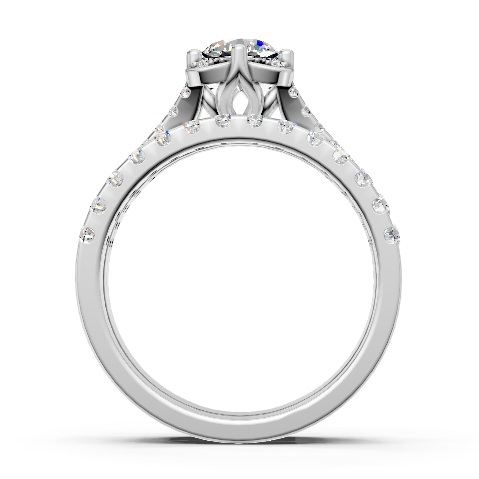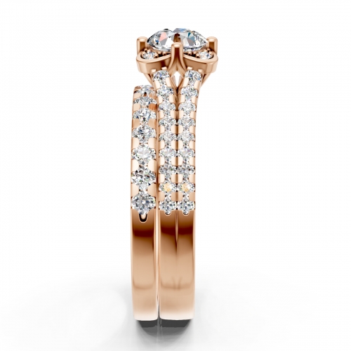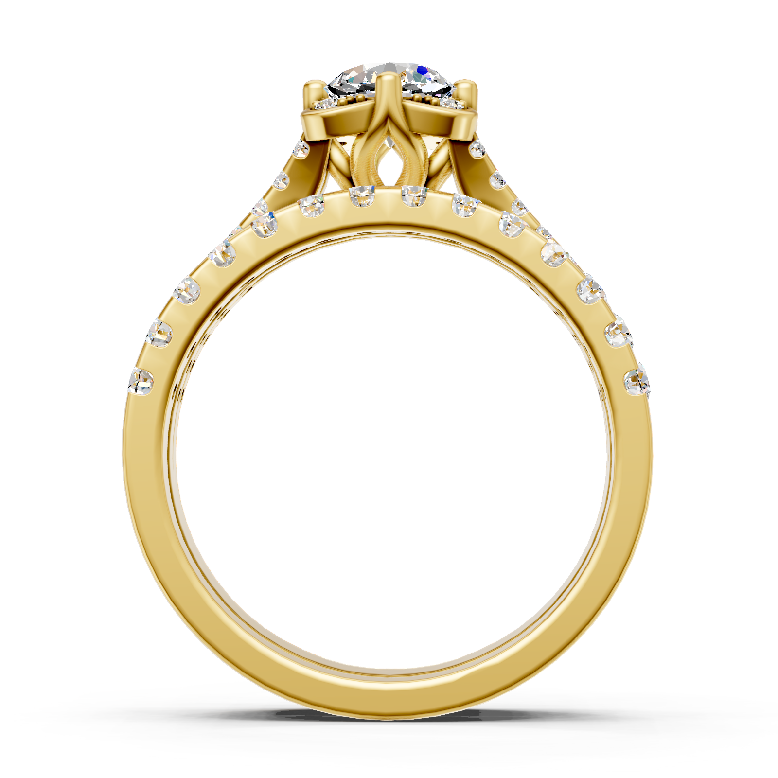 Zachwycający design podwójnego pierścionka prezentuje piękny brylant o okrągłym szlifie osadzony w tulipanowej oprawie na jednej z obrączek, która otacza pierścień czterema płatkami, powiązanymi cienką, idealnie wyprofilowaną linią; każdy płatek zdobi brylant. Dzielona szyna obrączki także ozdobiona jest rzędami mniejszych brylancików. Druga obrączka kompletu również lśni, bogato zdobiona brylantami. Na życzenie wykonamy pierścionek z żółtego, białego lub różowego złota.