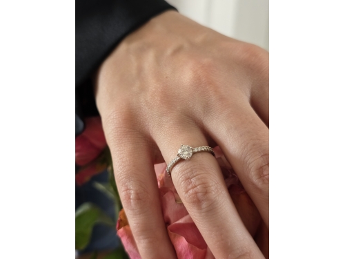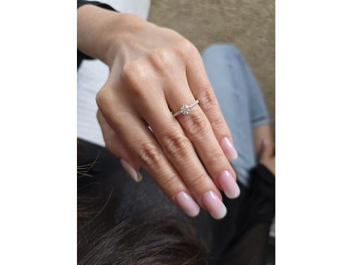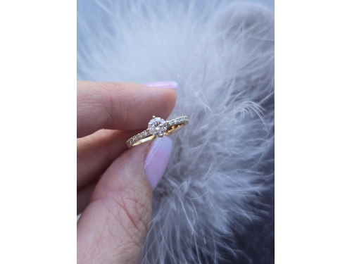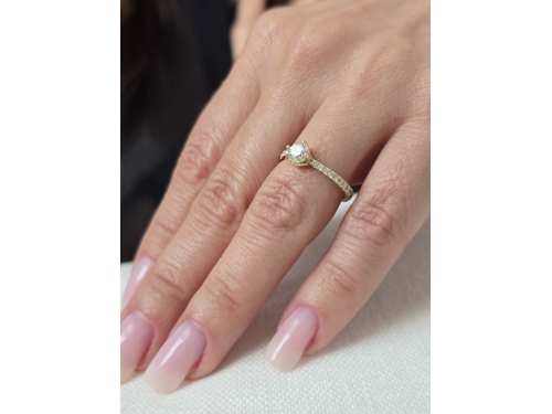 Piękny, delikatny, lecz wyrazisty projekt pierścionka zaręczynowego prezentuje obrączkę wysadzaną brylantami w żłobieniach szyny, na szczycie której osadzony jest brylant cetralny w oprawie z czterema łapkami. Na życzenie wykonamy pierścionek z żółtego, białego lub różowego złota.