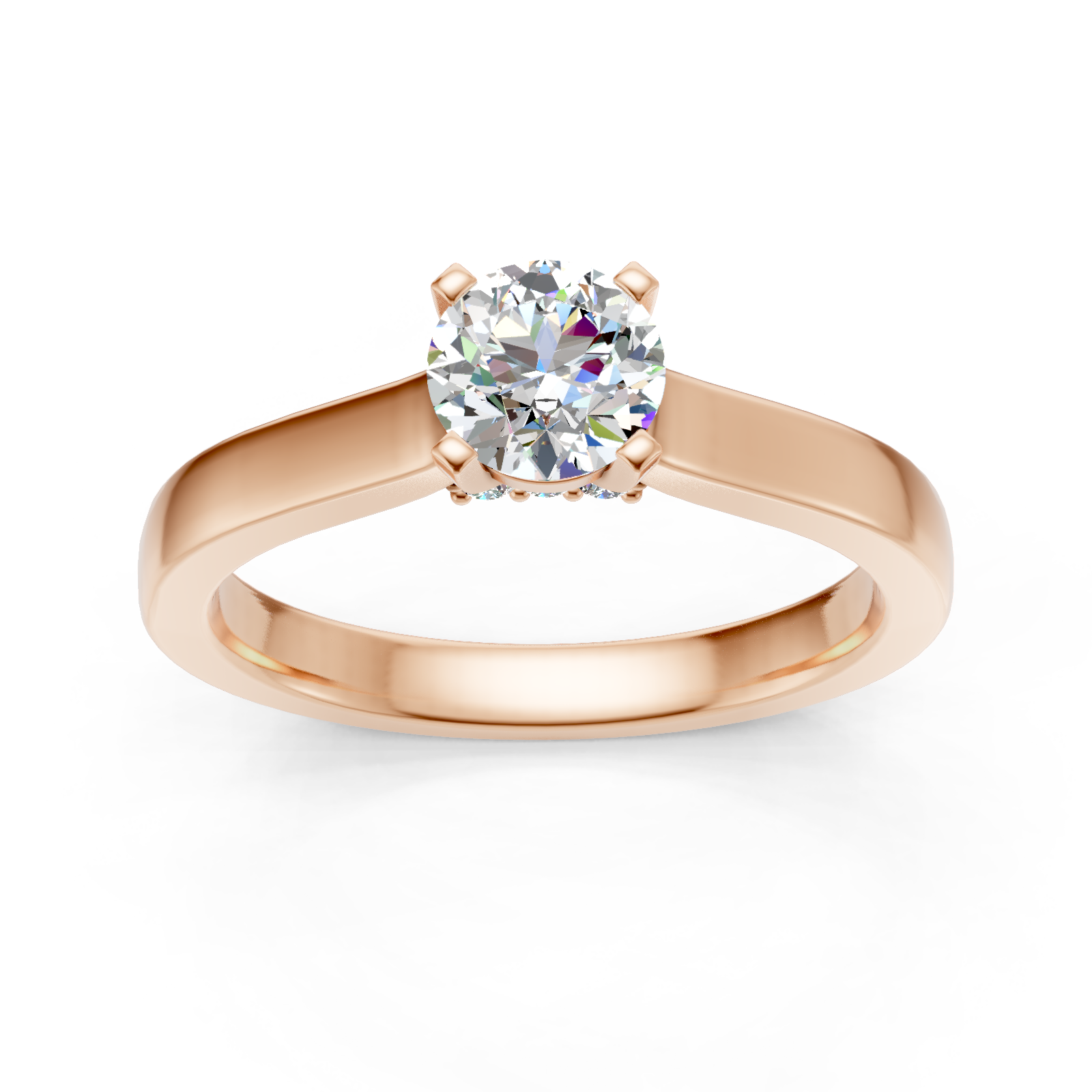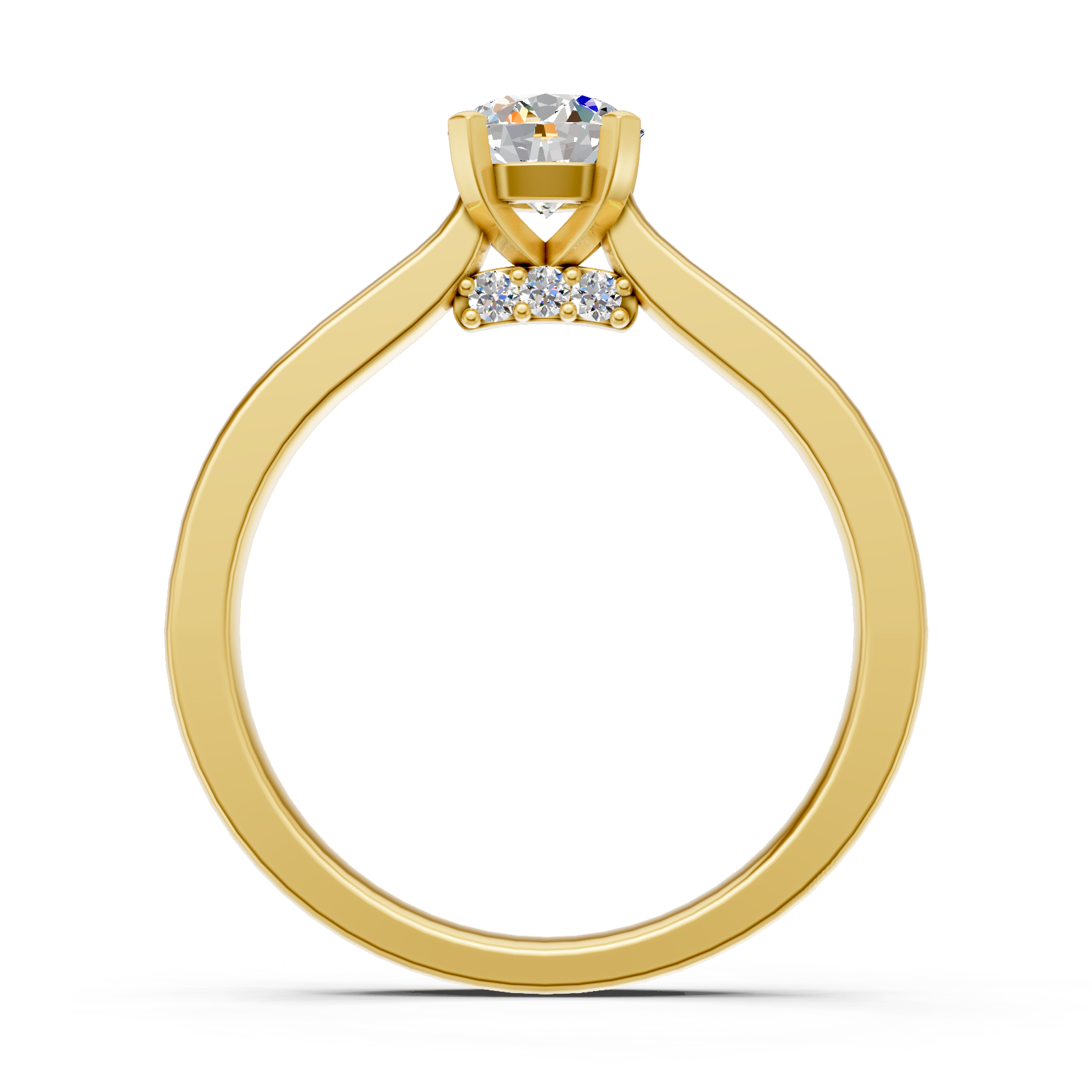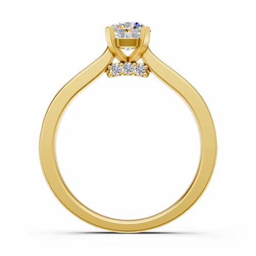Delikatny, klasyczny projekt pierścionka przedstawia piekny diament o szlifie brylantowym, umieszczony w oprawie z czterema łapkami. Prawdziwą niespodzianką w projekcie pierścionka są mniejsze diamenty, osadzone na szynie pod centralnym kamieniem. Na życzenie wykonamy pierścionek z żółtego, białego lub różowego złota.