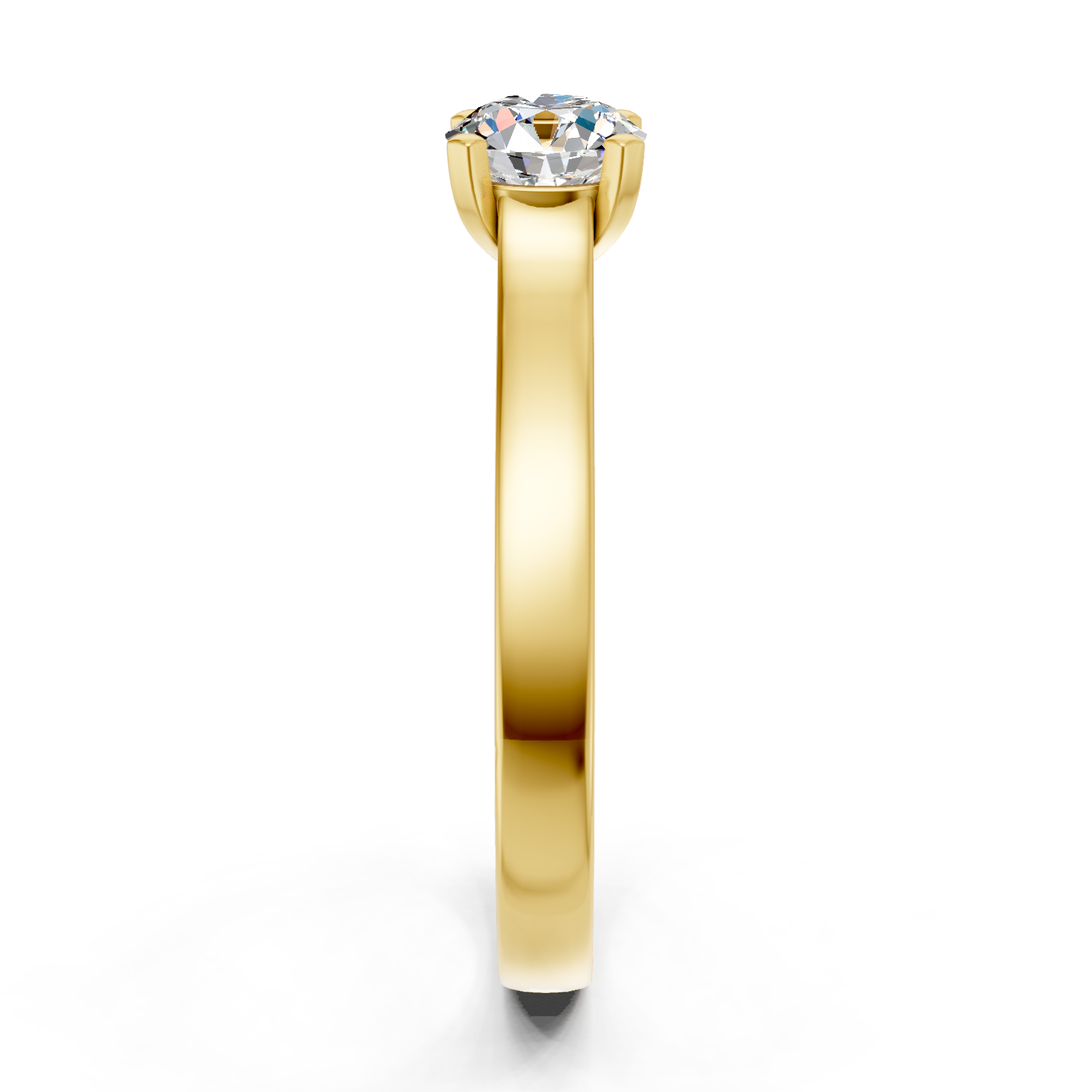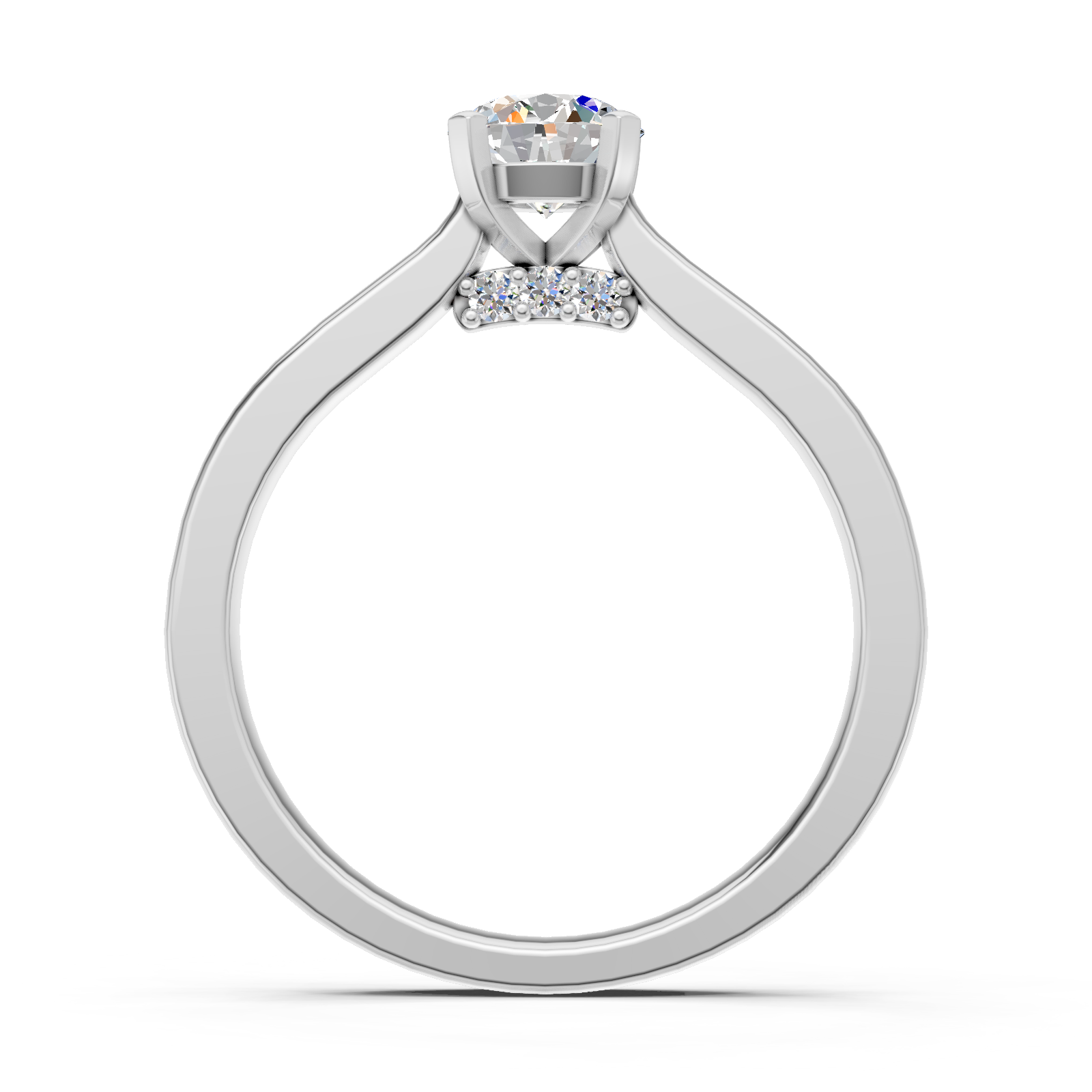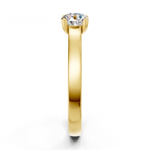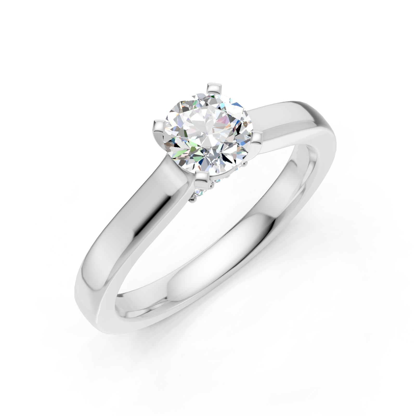 Delikatny, klasyczny projekt pierścionka przedstawia piekny diament o szlifie brylantowym, umieszczony w oprawie z czterema łapkami. Prawdziwą niespodzianką w projekcie pierścionka są mniejsze diamenty, osadzone na szynie pod centralnym kamieniem. Na życzenie wykonamy pierścionek z żółtego, białego lub różowego złota.