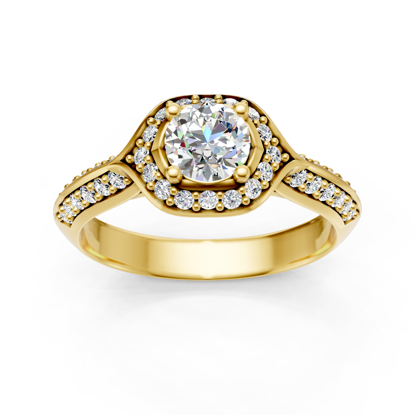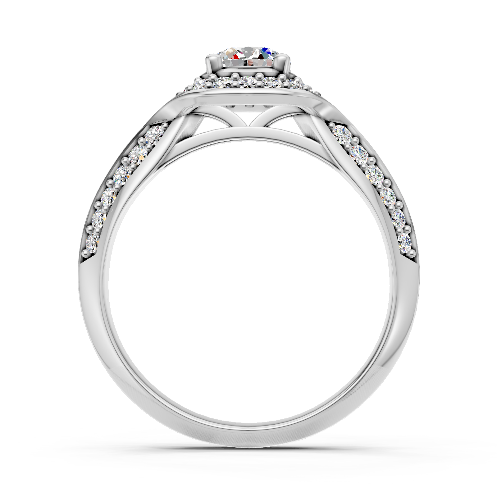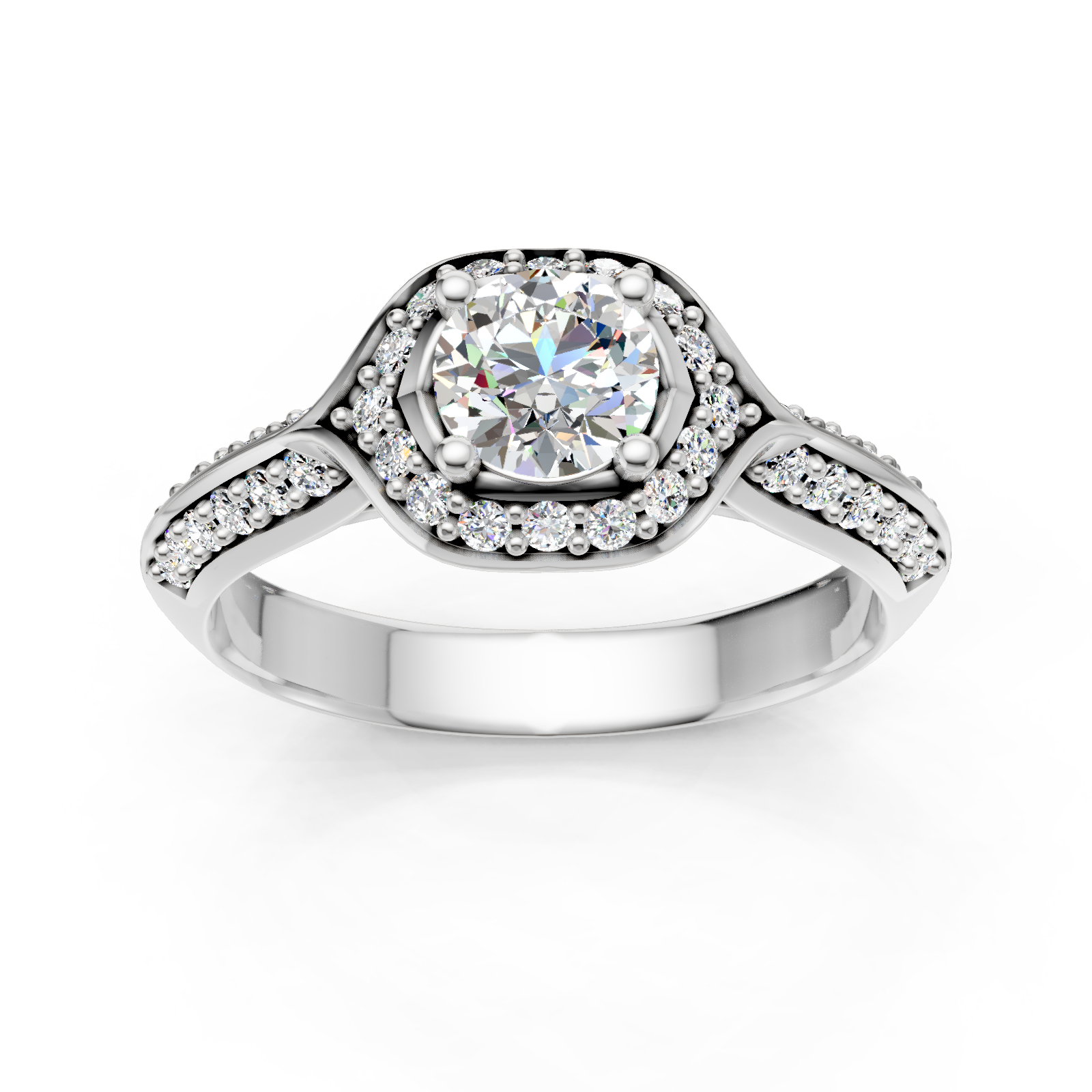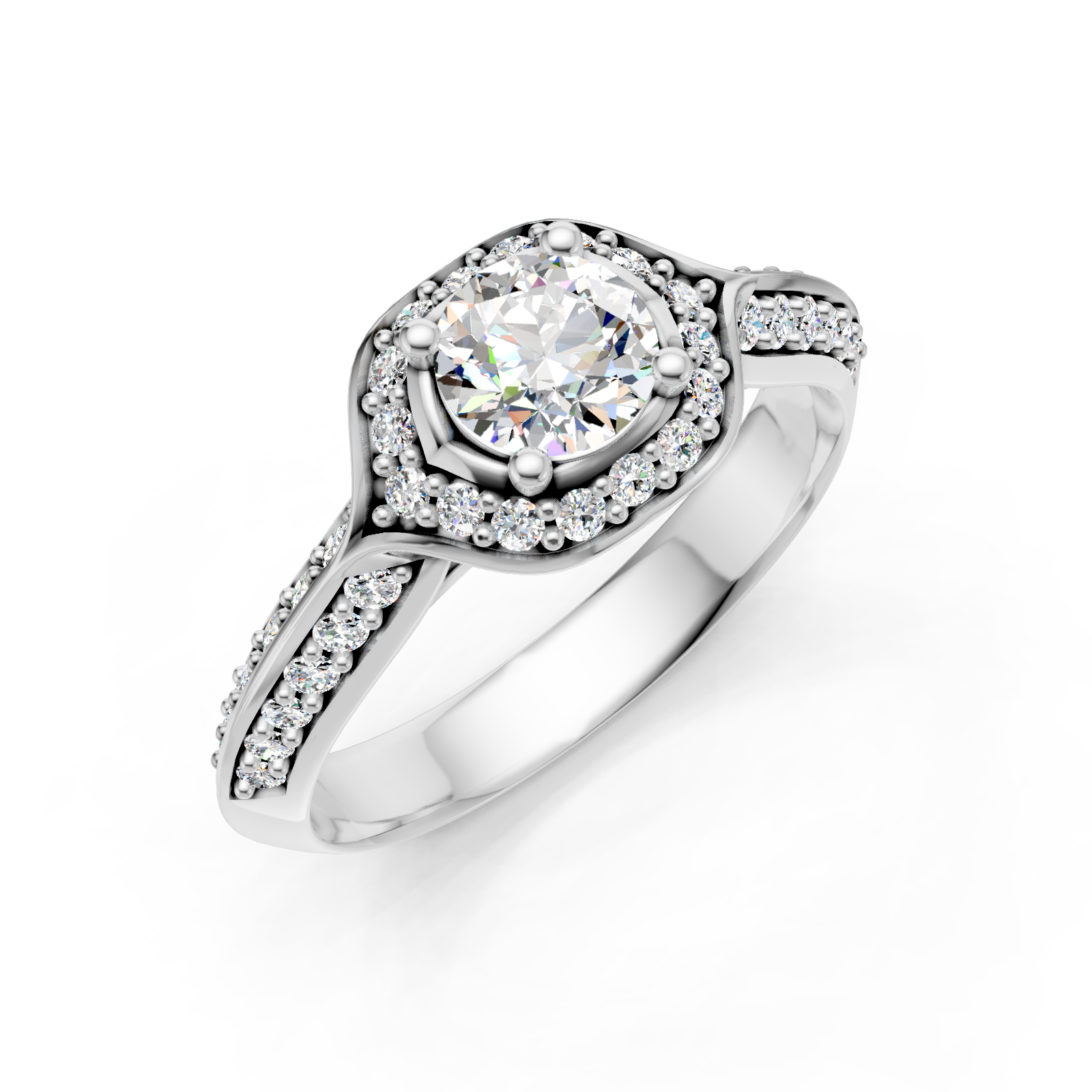 Styl, klasyka i nowoczesność - ten wspaniały projekt pierścionka prezentuje okrągły diament o szlifie brylantowym, otoczony lśniącą sześciokątną koroną wyłożoną mniejszymi diamentami. Bogaty akcent lśnienia wzmacniają brylanty osadzone w dwóch rzędach na szynie po obu stronach centralnego kamienia. Na życzenie wykonamy pierścionek z żółtego, białego lub różowego złota.