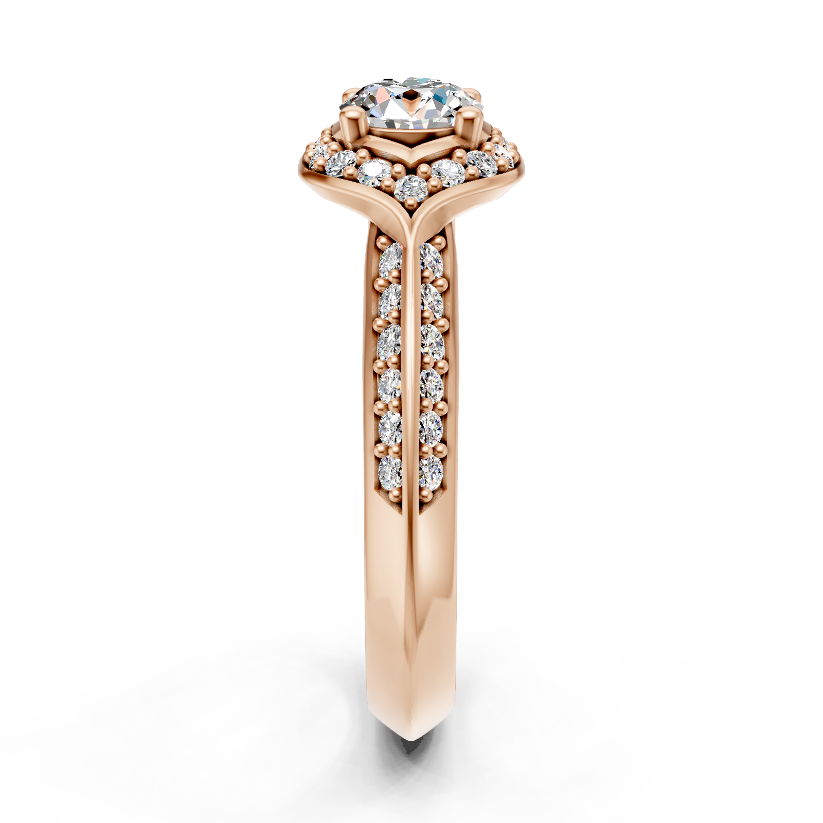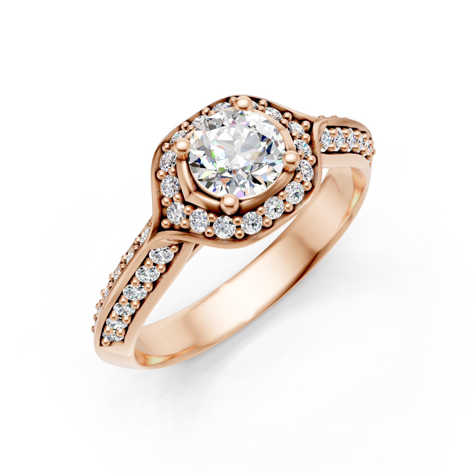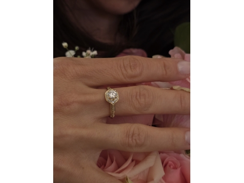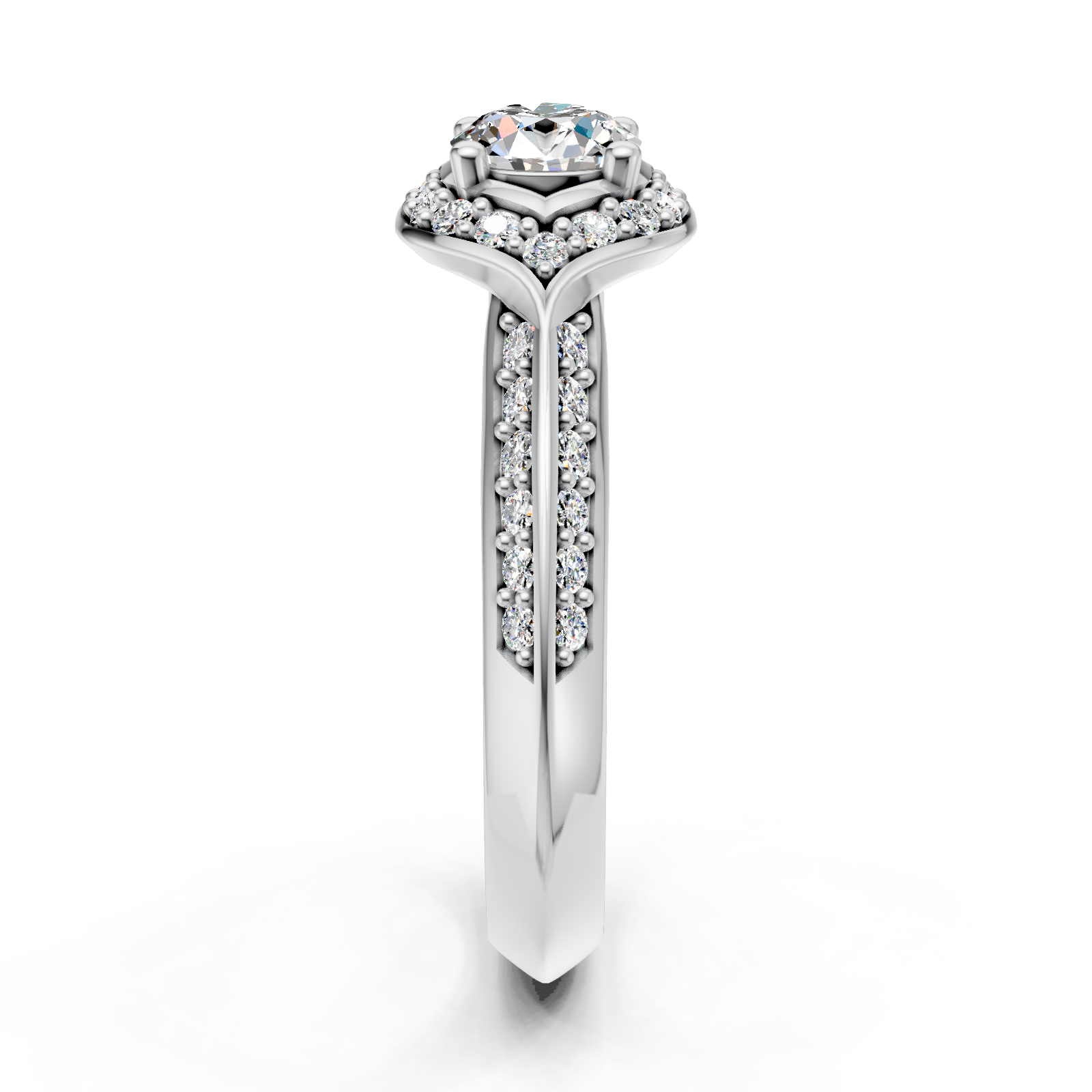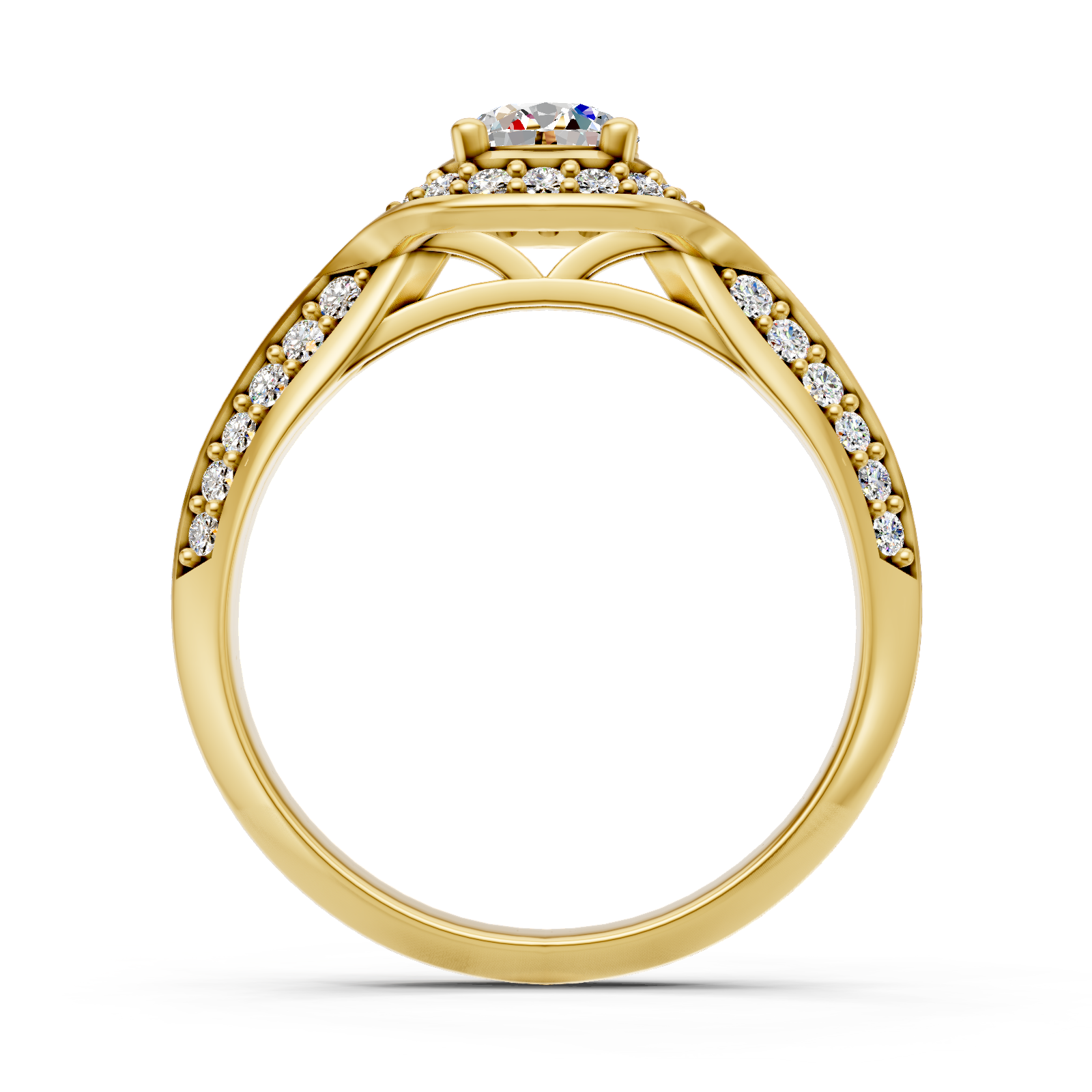 Styl, klasyka i nowoczesność - ten wspaniały projekt pierścionka prezentuje okrągły diament o szlifie brylantowym, otoczony lśniącą sześciokątną koroną wyłożoną mniejszymi diamentami. Bogaty akcent lśnienia wzmacniają brylanty osadzone w dwóch rzędach na szynie po obu stronach centralnego kamienia. Na życzenie wykonamy pierścionek z żółtego, białego lub różowego złota.