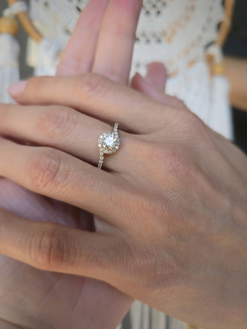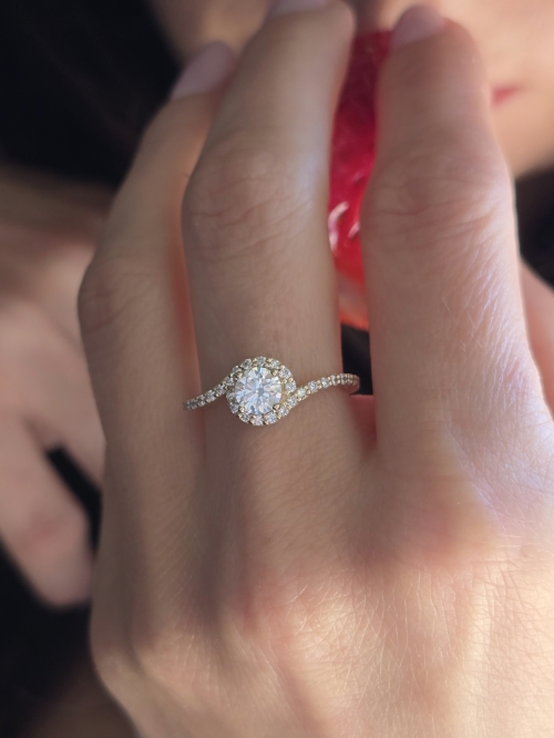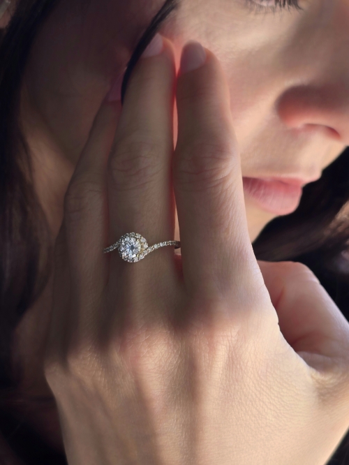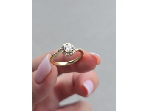 Ten wspaniały pierścionek zaręczynowy, będący wariacją na temat klasycznego pierścionka, prezentuje wirującą jak fale szynę obrączki wysadzaną drobnymi diamentami, która wije się wokół centralnego okrągłego kamienia, tworząc olśniewający blask. Na życzenie wykonamy pierścionek z żółtego, białego lub różowego złota.